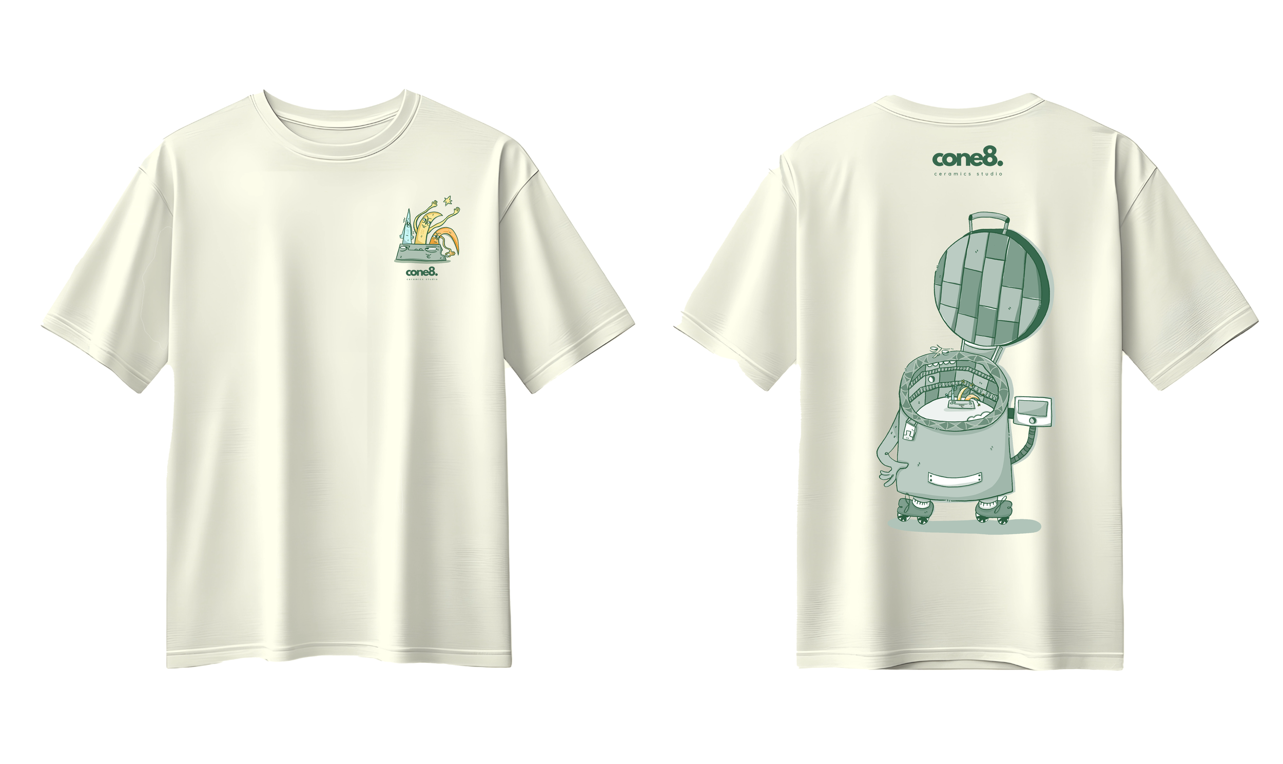 I was commissioned by Cone Eight Ceramics Studio to design a Tee shirt for their staff. In conversation with the co founder, KC, I learned the story behind the studio’s name. Cone eight refers to the optimal temperature for firing pottery. During every firing, a cone pack is placed inside the kiln to measure heat accurately. From time to time, the makers peek through the kiln’s spyhole to check the progress. Each cone pack includes cones seven, eight and nine. By the end of the firing, cone seven will have flattened completely, cone eight forms the perfect curved shape, and cone nine remains standing stiff and straight, making cone eight the ideal firing point